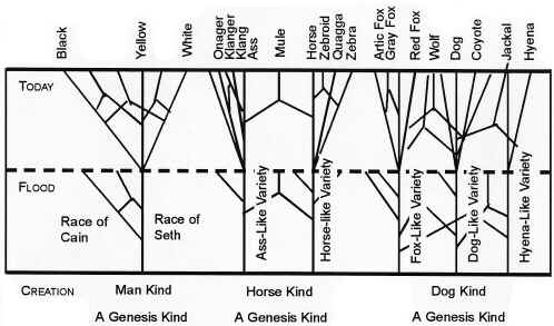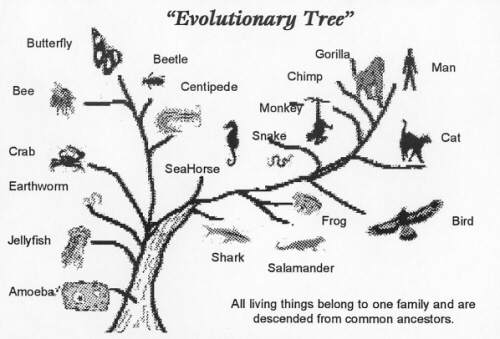 How can documentation of evolution of horses into horses, moths into moths, minulus into minulus, fruitflies into fruitflies, prove the evolution from amoeba to man? At every stage of the evolutionary tree, there are question marks demanding proof for common ancestry of all organism. (See diagram.)